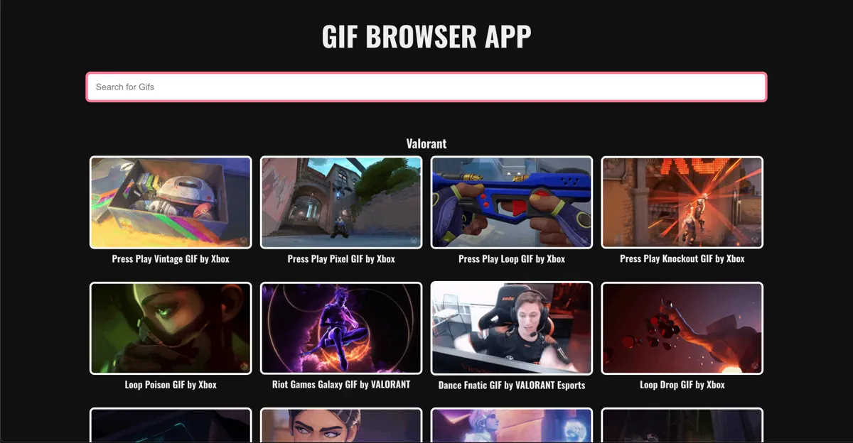 A simple React app that allows users to search for GIFs using the Giphy API. Users can enter a keyword and view a grid of related GIFs. The app is built with React and uses the Giphy API to fetch GIF data.A simple React app that allows users to search for GIFs using the Giphy API. Users can enter a keyword and view a grid of related GIFs. The app is built with React and uses the Giphy API to fetch GIF data.A simple React app that allows users to search for GIFs using the Giphy API. Users can enter a keyword and view a grid of related GIFs. The app is built with React and uses the Giphy API to fetch GIF data....